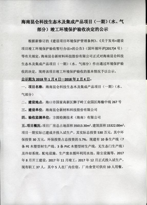 作出昆仑木塑项目(一期)(水、气审定稿)验收决定的公示